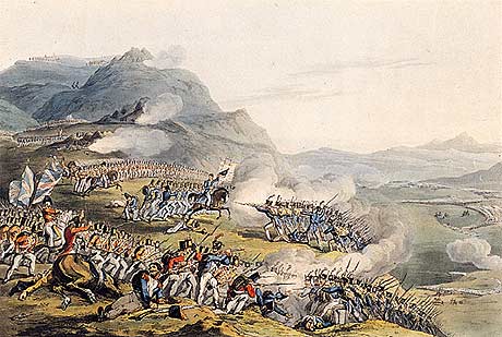 Num repente saltam em pequena nuvem junto á aldeia logo seguidos por duas colunas de infantaria que trepam corajosamente até ás três primeiras baterias do capitão Hew Ross . É o general Simon , comandante de brigada quem comanda o súbito assalto. A surpresa do movimento arrasta na frente o batalhão de Caçadores 3 e obriga a artilharia a retirar deixando três peças no terreno. Sobre uma delas salta o general como que a querer tomar-lhe posse. No mesmo instante surgem de surpresa, os ingleses do 43,45 e 52 que se abrigavam atrás da crista e efectuam uma descarga a vinte metros caindo ferido o próprio general que ficou prisioneiro. Seguiu-se uma tremenda carga á baioneta que empurrou com violência a coluna francesa pela montanha abaixo deixando inúmeras vítimas espalhadas em redor. O mesmo sucedeu á brigada Ferrey que foi dizimada pela brigada Coleman enquanto a artilharia britânica e portuguesa varrem os flancos e o centro dos franceses em fuga.